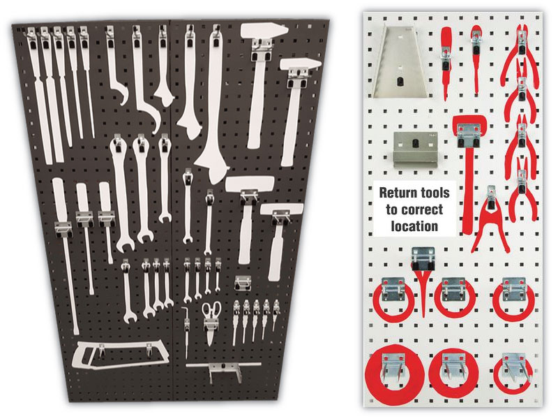 Shadow boards have the outline or silhouette of the tool shape on the board, allowing operators to identify quickly which tools are in use or missing.