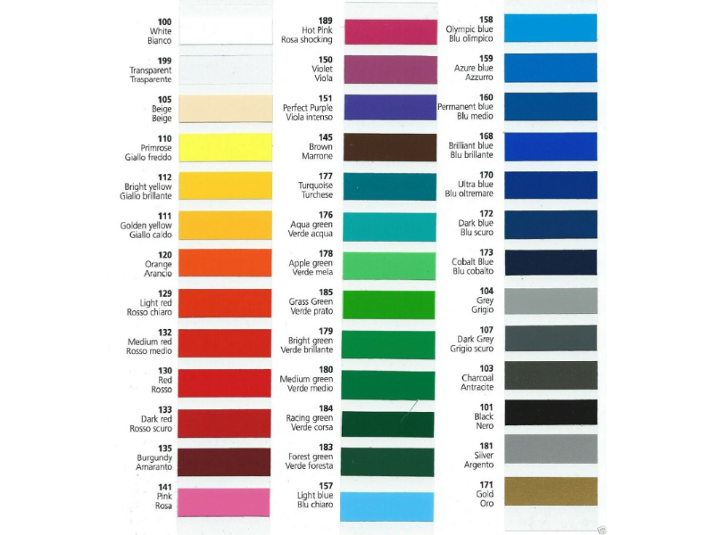 Colour | Black, Charcoal, Gold, Pink, Red, Turquoise, White, Apple Green, Aqua Green, Azure Blue, Beige, Bright Green, Bright Yellow, Brilliant Blue, Brown, Burgundy, Clear, Cobalt Blue, Dark Blue, Dark Grey, Dark Red, Forest Green, Golden Yellow, Grass Green, Grey, Hot Pink, Light Blue, Light Red, Medium Green, Medium Red, Olympic Blue, Orange, Perfect Purple, Permanent Blue, Primrose, Racing Green, Silver, Ultra Blue, Violet |