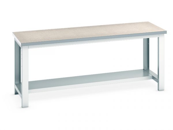 cubio framework bench with half depth base shelf. Featuring a heavy duty steel channel, framework with 40mm lino worktop. Optional storage units available. Finished in durable powder coat paint in RAL 7035 light grey. WxDxH: 2000x750x840mm.